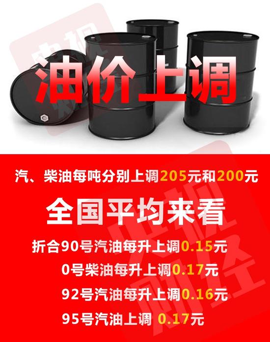 全国平均来看,折合90号汽油每升上调0.15元,92号汽油每升上调0.16元,95号上调0.17元,0号柴油每升上调0.17元。按一般家用汽车油箱50L容量估测,加满一箱92号汽油将多花约8块钱。