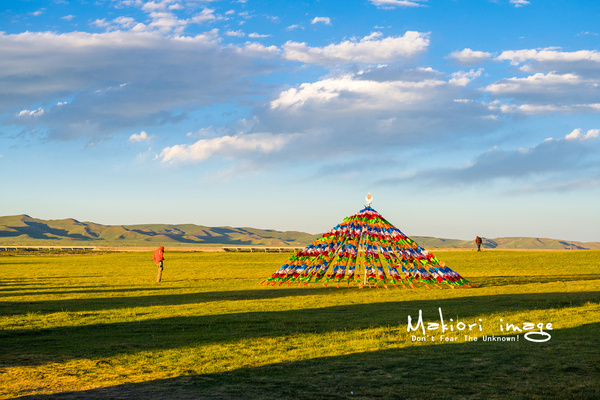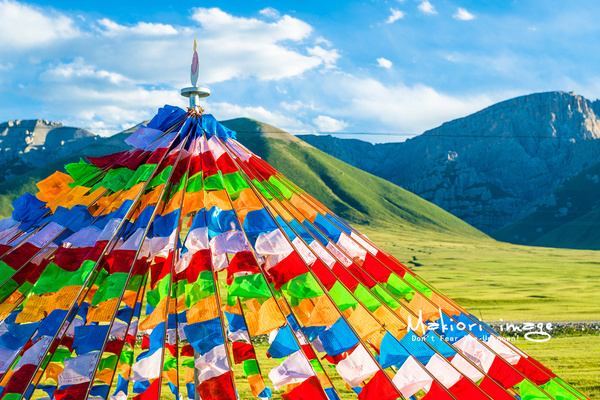 经幡随风飘动,每飘动一次,吉祥祝福的意愿就飘向远方。我坐在不远处的草坪上,带着虔诚凝视了许久。
