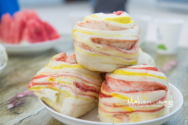 青海的花卷是带有颜色,一开始我们以为是用食用颜料染成的,一问才知道是用姜黄等其他调料烹制而成,不仅仅外形上色彩丰富,而且会带有咸味。