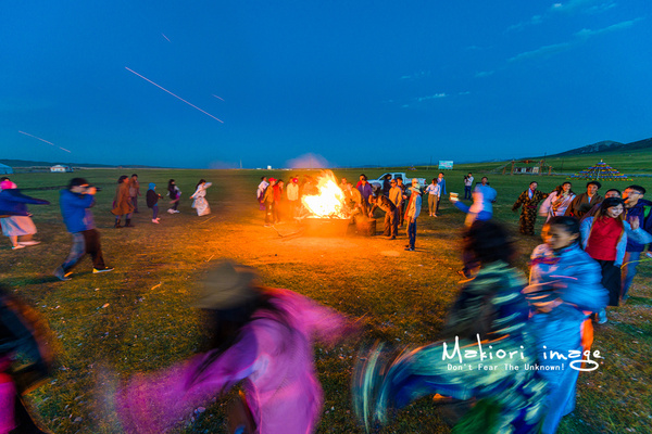 夜色袭来,天空的云彩也被阳光染上了一层绯红,大地开始沉睡,山上放牧归来的牛羊时不时发出几声叫唤。但是,一场别开生面的草原party却即将上演。